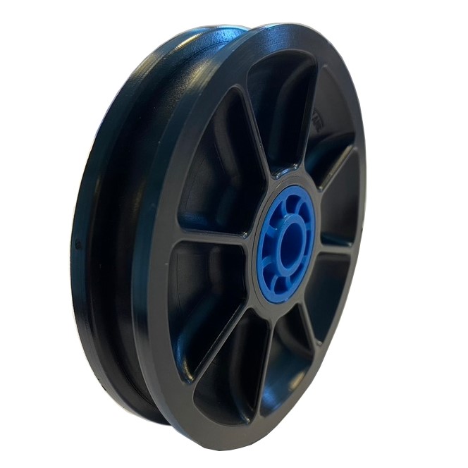 Insieme al cuscinetto a strisciamento la carrucola è realizzata al 100% in plastica e pertanto completamente protetta dalla corrosione e da ulteriori agenti atmosferici.
